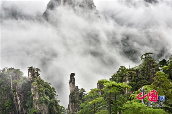 8月31日,安徽黃山風(fēng)景區(qū)一場秋雨后,云霧飄渺隨風(fēng)而動,時而如輕紗在峽谷里翩翩起舞,嫵媚動人,時而又在千峰萬壑中驚濤駭浪,一瀉千里,與黃山奇松、怪石相映成趣,好似一幅幅流動的畫卷,給來山游客帶來一場盛大的視覺盛宴。