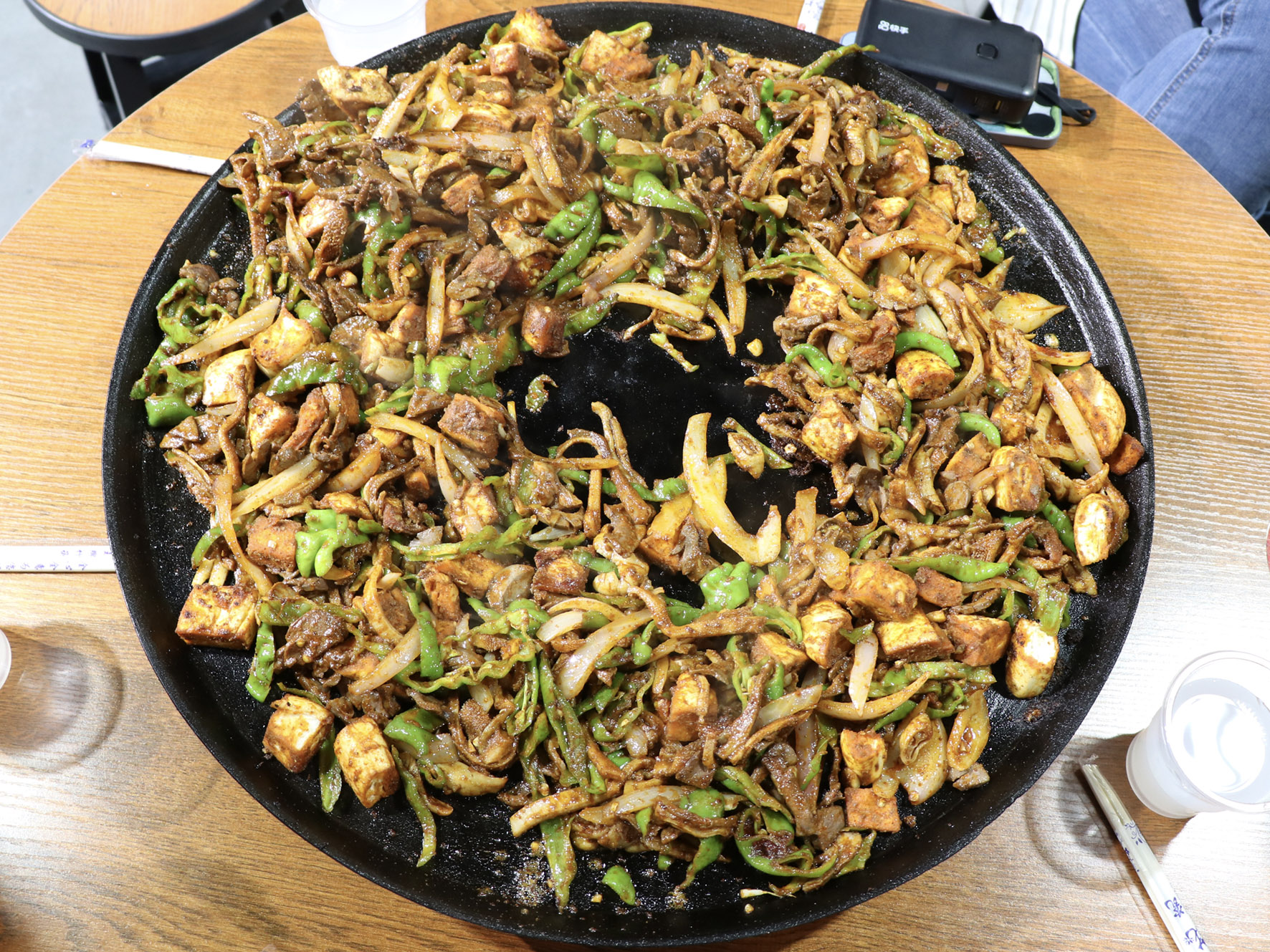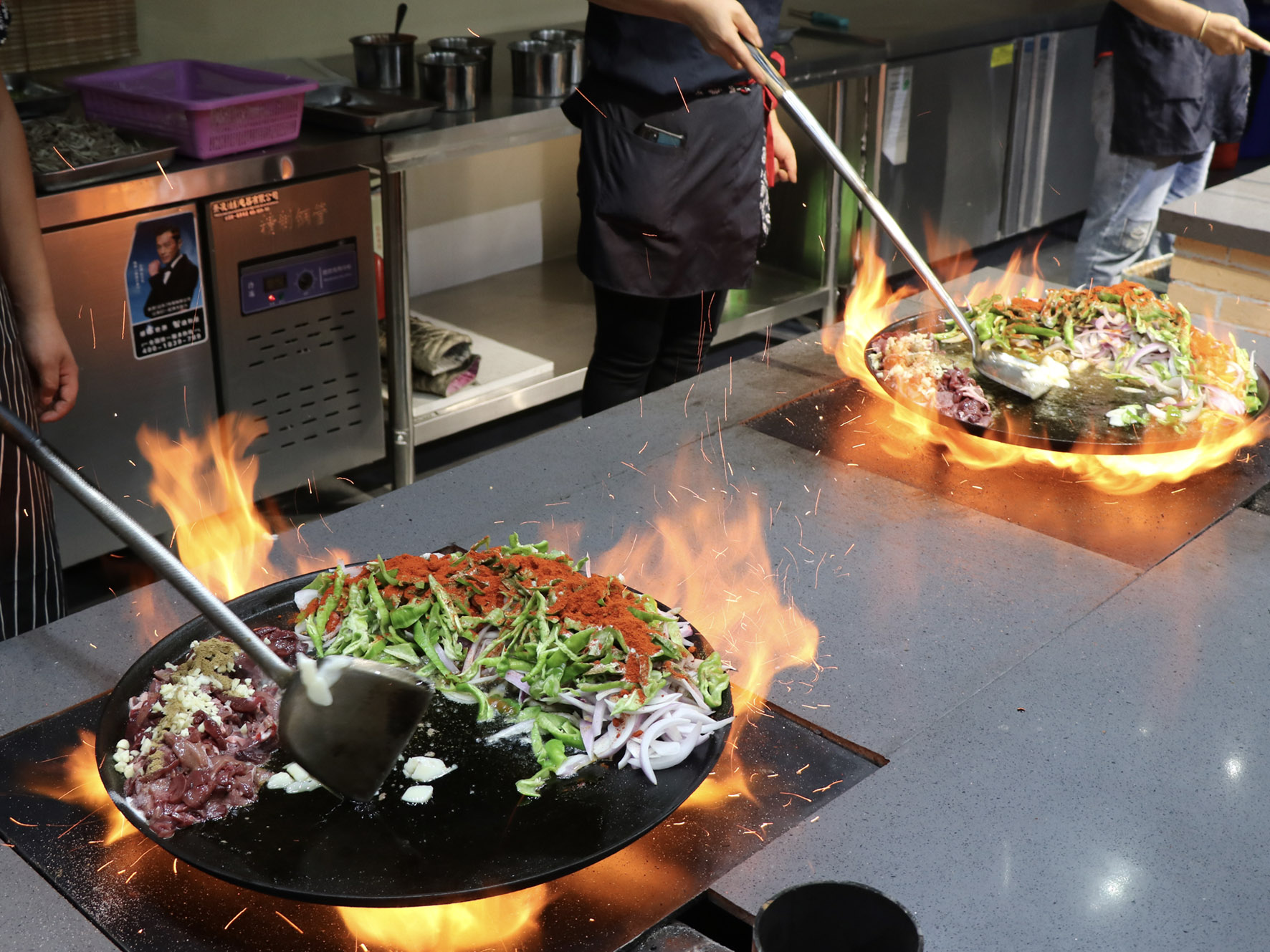 最美味的食物往往來自于最樸素的食材,只見店家將切好的羊肝、肺、肚、腸、心等佐以洋蔥、青椒下入一個鑄鐵鏊子里,再加上幾勺鹽和辣椒面,開始用猛火爆炒,火星四濺,一頓撥拉之后,待到七分熟左右再放入提前準(zhǔn)備好的白餅塊一起翻炒即可。