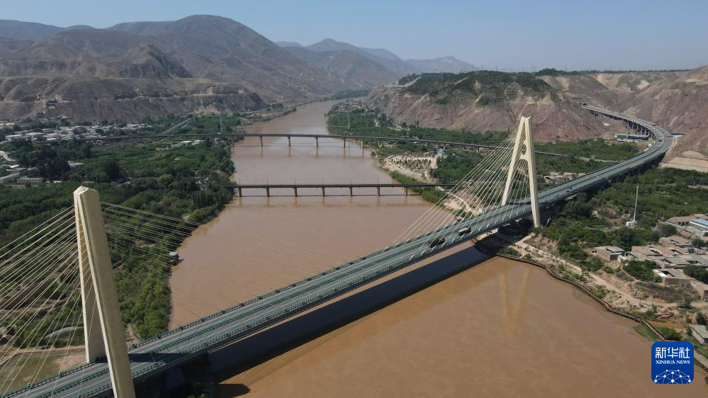 緊鄰甘肅省蘭州市西固區(qū)河口古鎮(zhèn)的高速公路大橋橫跨黃河(7月9日攝,無人機照片)。新華社記者 張可任 攝