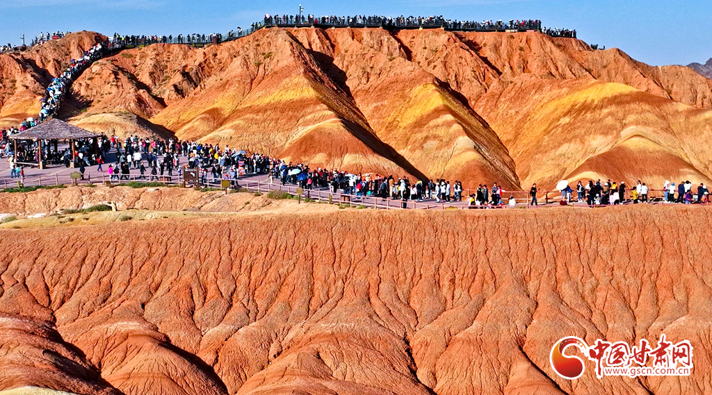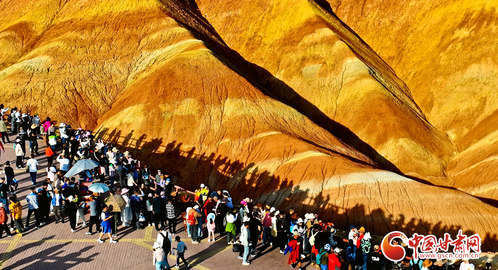 張掖七彩丹霞地貌群以其層理交錯、巖壁陡峭、氣勢磅礴、造型奇特、色彩斑斕而稱奇。2020年,國家文化和旅游部確定張掖七彩丹霞景區(qū)為國家5A級旅游景區(qū);同年,張掖地質(zhì)公園獲批“聯(lián)合國教科文組織世界地質(zhì)公園”。據(jù)七彩丹霞景區(qū)管委會統(tǒng)計,當(dāng)日是中秋國慶假期第二天,該景區(qū)游客量達(dá)29000多人?!?/p>