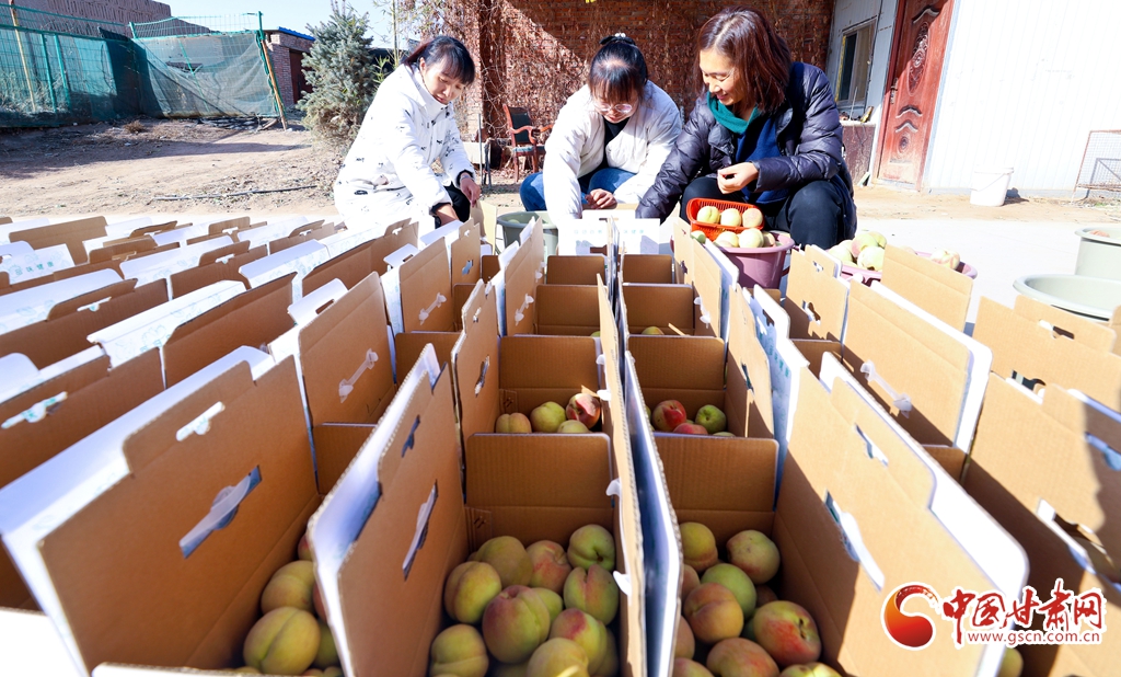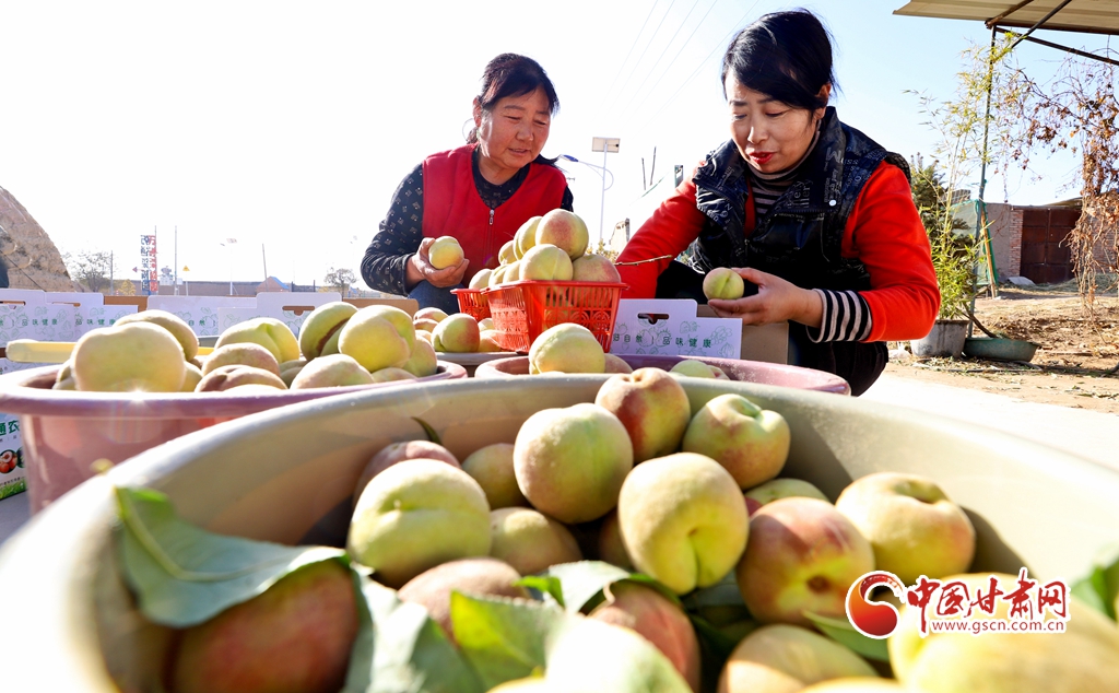 11月13日,甘肅省張掖市甘州區(qū)長(zhǎng)安鎮(zhèn)一果蔬種植專(zhuān)業(yè)合作社“甘泉雪桃”種植基地大棚內(nèi),種植農(nóng)戶(hù)正在采摘成熟的“甘泉雪桃”。