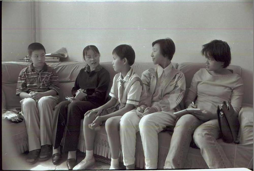 2000年,魏彤欣(左二)在采訪中。阜新市傳媒中心供圖