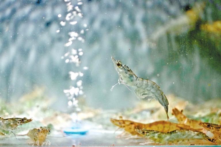 偌大的水池邊,工作人員正拿著網(wǎng)兜熟練地起蝦,隨著打撈大網(wǎng)慢慢收攏,一尾尾晶瑩剔透、活蹦亂跳的南美白對蝦跳躍出水,分揀、稱重、充氧、裝袋……