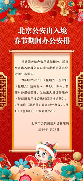 據(jù)北京市公安局出入境管理局官方微博消息,北京市公安局出入境管理局發(fā)布春節(jié)期間辦公安排:北京市出入境服務(wù)窗口2月10日至17日(大年初一至初八)放假調(diào)休,共8天。期間,暫停對外提供受理、發(fā)放出入境證件服務(wù)(智能服務(wù)廳按公示時間正常運行)。