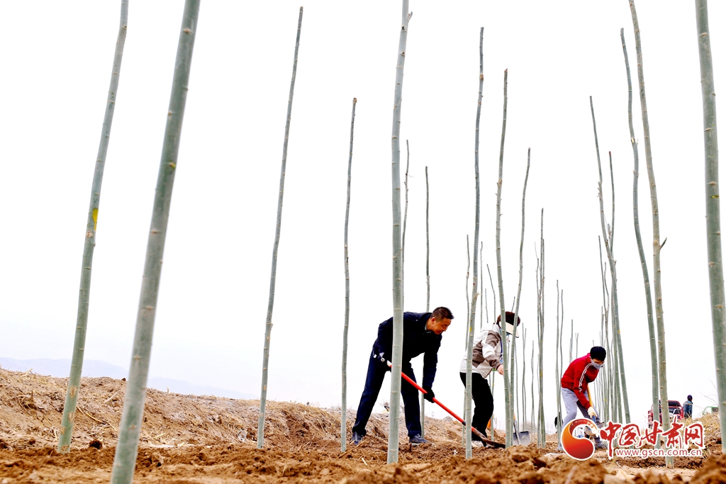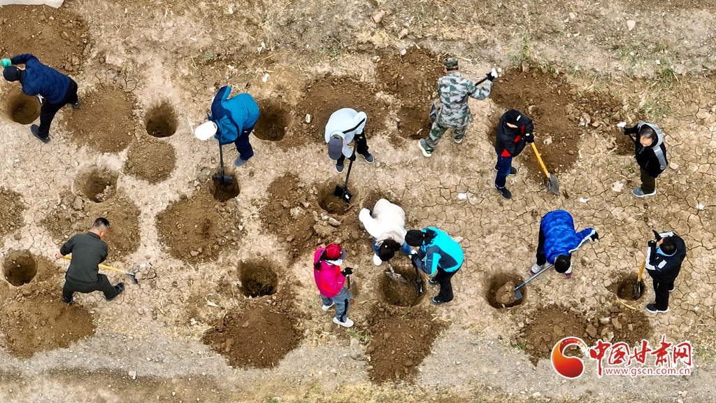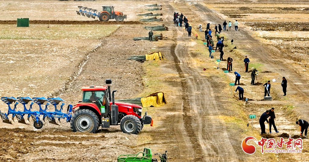 4月9日,甘肅省張掖市甘州區(qū)三閘鎮(zhèn)高寨村義務(wù)植樹(shù)基地上,千名當(dāng)?shù)馗刹柯毠ず椭驹刚邆儞]鍬鏟土挖樹(shù)坑,掀起農(nóng)田防護(hù)林建設(shè)和防沙治沙春季植樹(shù)造林熱潮。