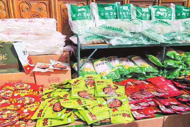 在城門入口的一個代銷店,各種包裝的麻辣燙底料、定西寬粉吸引了許多游客前來購買。