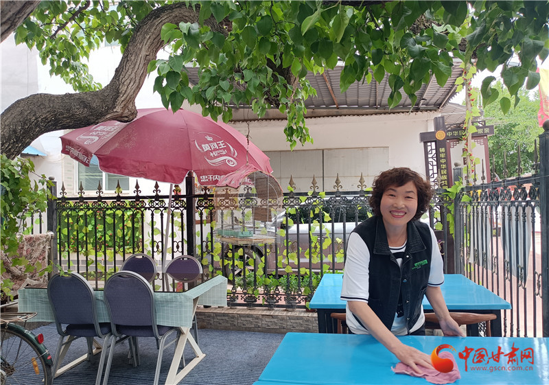 在梨園掩映中,上車村村民彭霞清家的小院安靜美好。進入六月,梨園也進入一年當(dāng)中生命力最旺盛的時節(jié),遮天蔽日的掩蓋讓這里成為蘭州人避暑的絕佳選擇,彭霞清也正在為即將到來的避暑旺季做準(zhǔn)備。