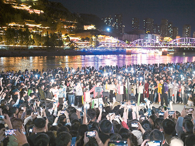 在黃河蘭州段近水平臺,市民及游客參與蘭州黃河大合唱活動?! ⌒氯A社記者 范培珅攝