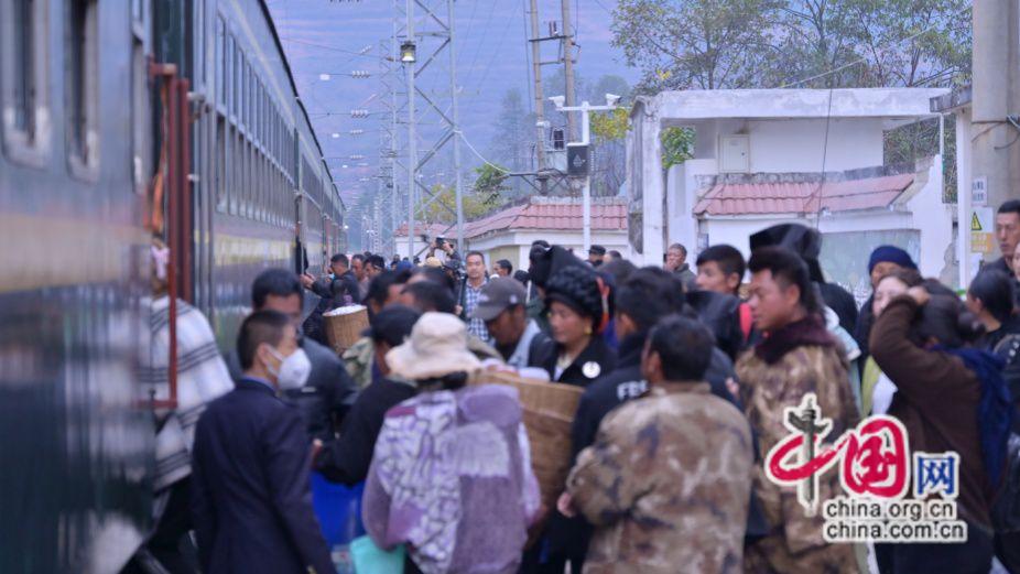 2024年11月20日,彝歷新年第一天,成昆線5633次慢火車停靠在站臺(tái),彝族同胞有序乘車。原波 攝