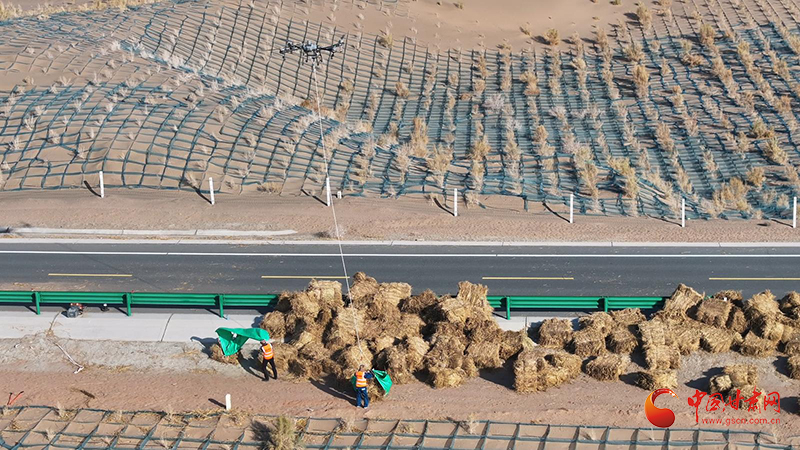 防沙治沙又一季,綠化造林年復(fù)年。這幾天,在金塔縣城至大墩門公路“三北”工程防沙治沙現(xiàn)場(chǎng),一捆捆稻草正排著隊(duì)乘坐無人機(jī)前往沙漠深處。走進(jìn)壓沙現(xiàn)場(chǎng),大家拉草埋沙,手提肩扛,或俯身鋪草,或揮鍬壓埋、填沙整型,分工明確、干勁十足。一臺(tái)壓沙車正在作業(yè),車輪駛過,稻草沙障便被植入沙漠里,劃線、鋪草、壓草,整個(gè)流程一氣呵成,效率大大提高。