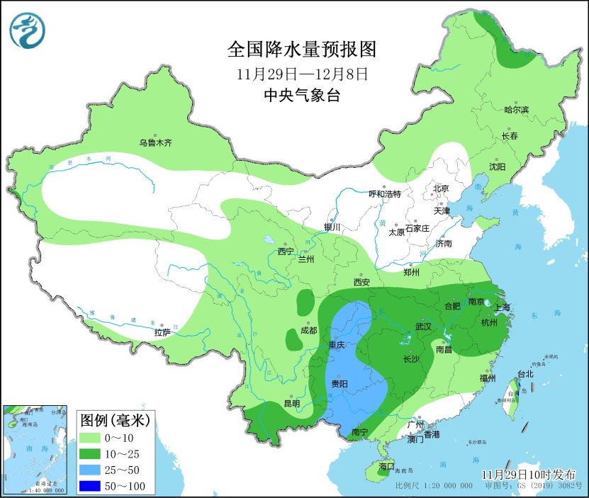 未來10天(11月29日-12月8日),東北地區(qū)中北部、內蒙古東北部等地部分地區(qū)累計降水量有8~15毫米;西南地區(qū)東部和南部、江漢、江淮、江南西部和北部、廣西西部及臺灣島等地部分地區(qū)有10~20毫米,局地30~60毫米;云貴高原、內蒙古東北部、東北地區(qū)等地部分地區(qū)累計降水量較常年同期偏多1~3倍,我國其余大部地區(qū)降水偏少。