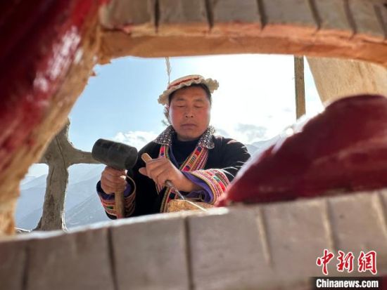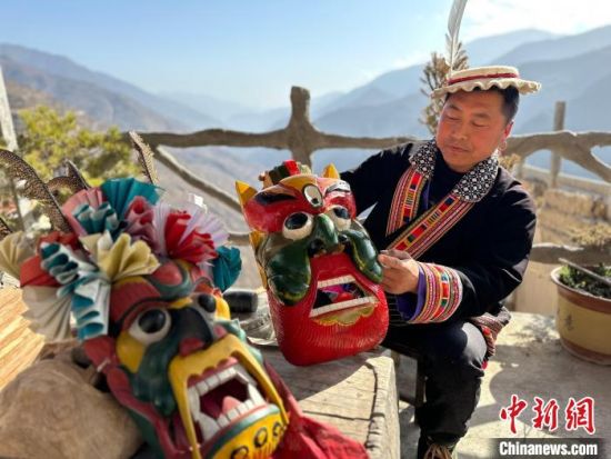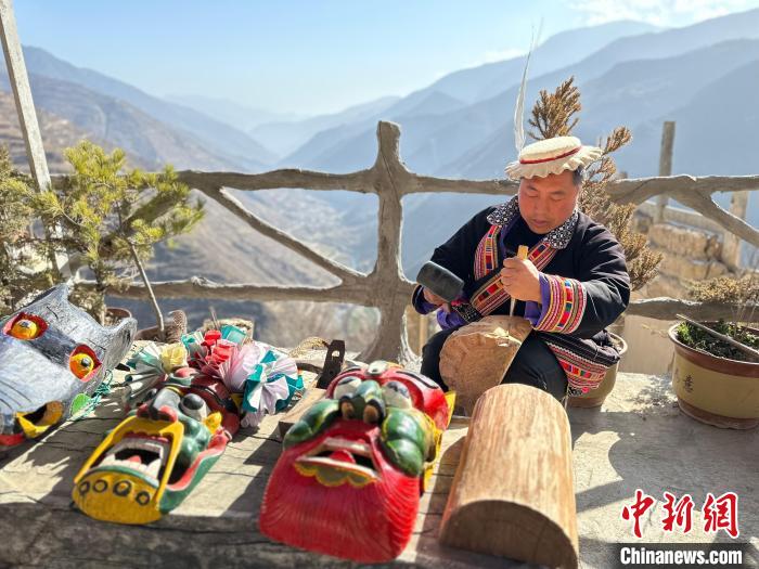 雕刻、打磨、上色……甘肅隴南市文縣鐵樓藏族鄉(xiāng)強(qiáng)曲村,白馬人薛剛一家四代人都精于木工。日前中新網(wǎng)記者走訪村子時,薛剛坐在自家院子里,伏案制作池哥晝所用面具。池哥晝是白馬人保留最完整、最具特色民族舞蹈,面具是重要道具之一。薛剛制作的面具不僅用于周邊村子的池哥晝中,而且被廣州、上海等地的客商購買收藏。他時常將自己的想象融入面具中,用心打磨使其更具“靈氣”。他說,白馬人中從事面具雕刻的手藝人不多,最近他物色了一個“00后”徒弟,對方興趣濃厚,希望將這門手藝保護(hù)傳承好。圖為薛剛在院子里雕刻面具。閆姣 攝