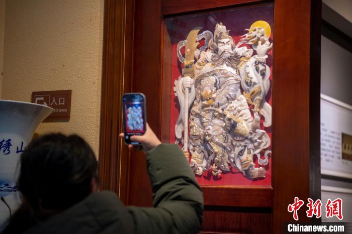 2月3日,游客在廣西北海貝雕博物館拍攝貝雕作品《日月門(mén)神》。 陳秋霞 攝