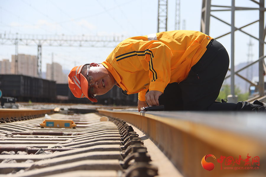 他們五人一組,兩人拿著檢查錘左右開(kāi)弓,敲擊檢查扣件和連接零件,通過(guò)聲響辨別扣件松緊;一人弓著腰,每隔三四根枕木就俯身用道尺測(cè)量軌距,一人記錄測(cè)量數(shù)據(jù)。劉亞雄則貓著腰穿梭在股道間,時(shí)而跨在鋼軌上彎腰看方向,時(shí)而雙手扶在滾燙的鋼軌上,趴在股道里線路查看高低。