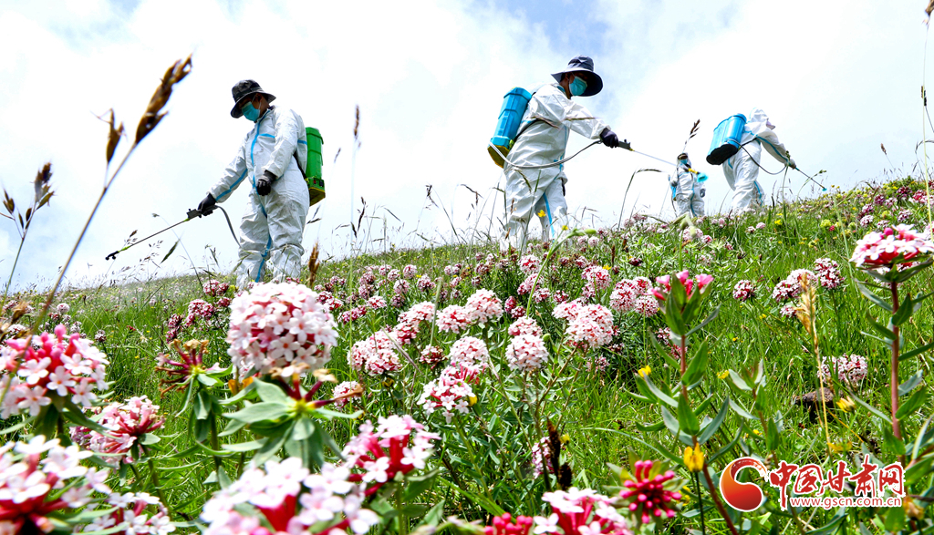 盛夏時(shí)節(jié),位于張掖市肅南裕固族自治縣的皇城夏日塔拉草原、康樂賽汗塔拉草原,宛如一塊巨大的綠色絨毯鋪向天際,滿目翠綠,令人心醉神迷。然而,此時(shí)也正是草原上狼毒花毒害草盛放、蝗蟲繁殖的高峰期。連日來,肅南縣林草專業(yè)技術(shù)人員帶領(lǐng)2000多牧民,抓住毒害草開花、蝗蟲繁殖最快,也是清除滅殺的最佳時(shí)機(jī),在“三北”工程六期160多萬畝廣袤的草原上,打響了以“蟲害防治+害草治理+噴施葉面+播撒草籽的”為核心的“三北”工程林草濕荒一體化保護(hù)修復(fù)攻堅(jiān)戰(zhàn)。